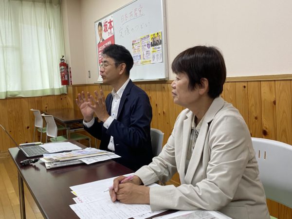 坂本ひろし県書記長と定塚地域交流センターで集いを行いました。高瀬あつこから最近の活動を報告しました。