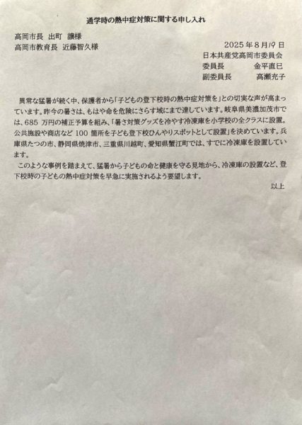 19日、日本共産党高岡市委員会は、他県での事例を示し、高岡市教育長に登下校時の熱中症対策を求めました。