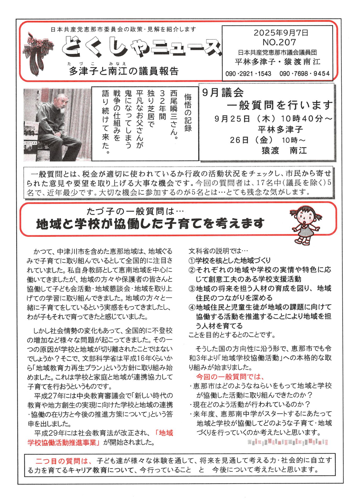 自衛隊名簿提出や恵那市の上下水道、子育て・教育の課題などを取り上げます。
