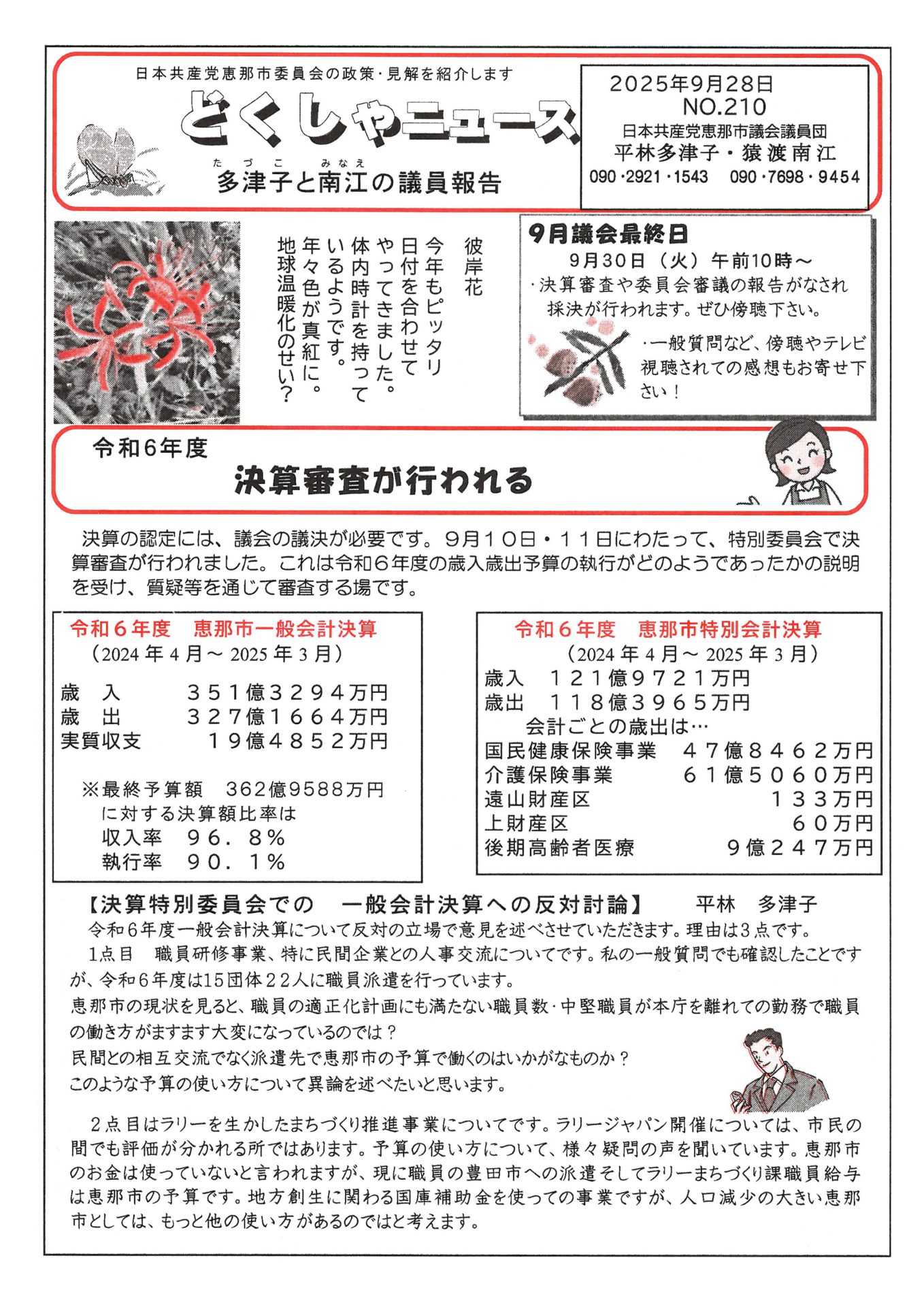 🔹一般会計・特別会計決算への反対討論(平林多津子市議)
