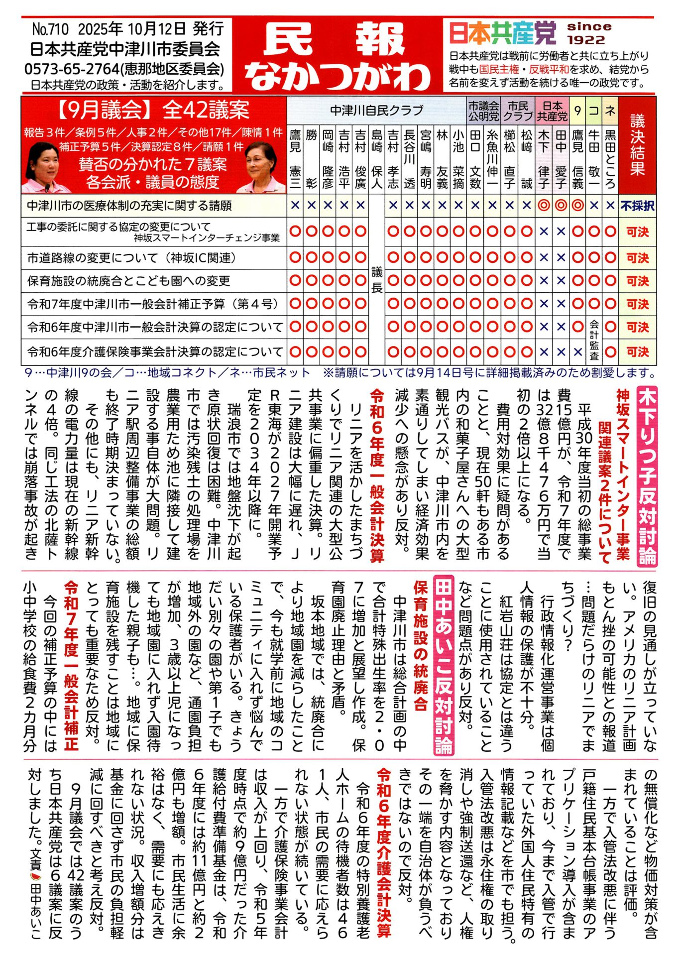 今回の民報なかつがわでは、9月議会で話し合われた42議案の内容や、各会派の態度をご紹介しています。