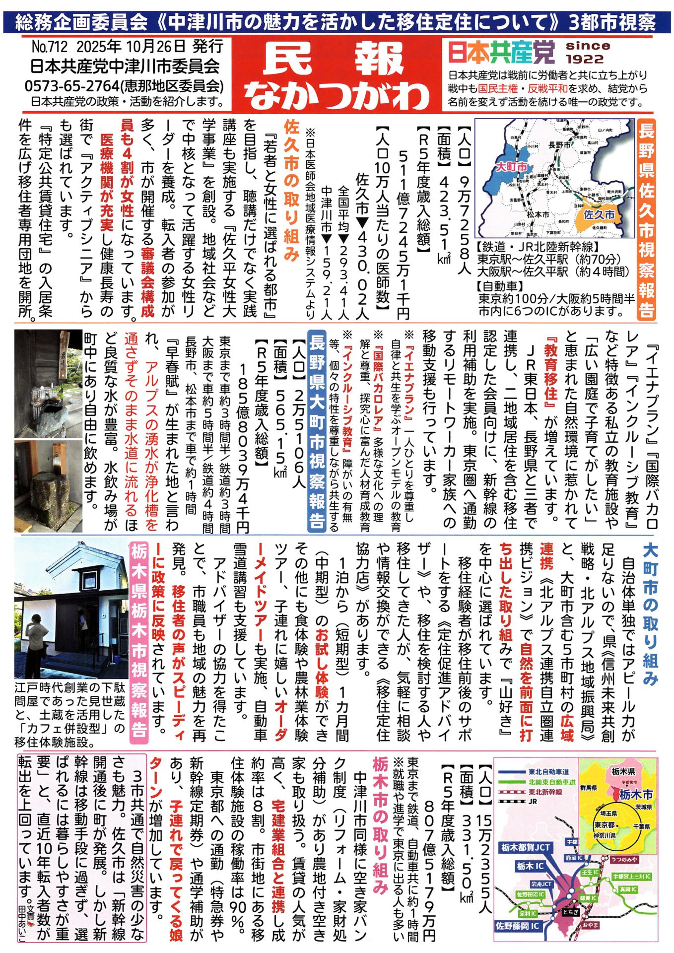 総務企画委員会では、「中津川市の魅力を活かした移住・定住について」をテーマに、長野県大町市・佐久市・栃木県栃木市の3都市を視察しました。