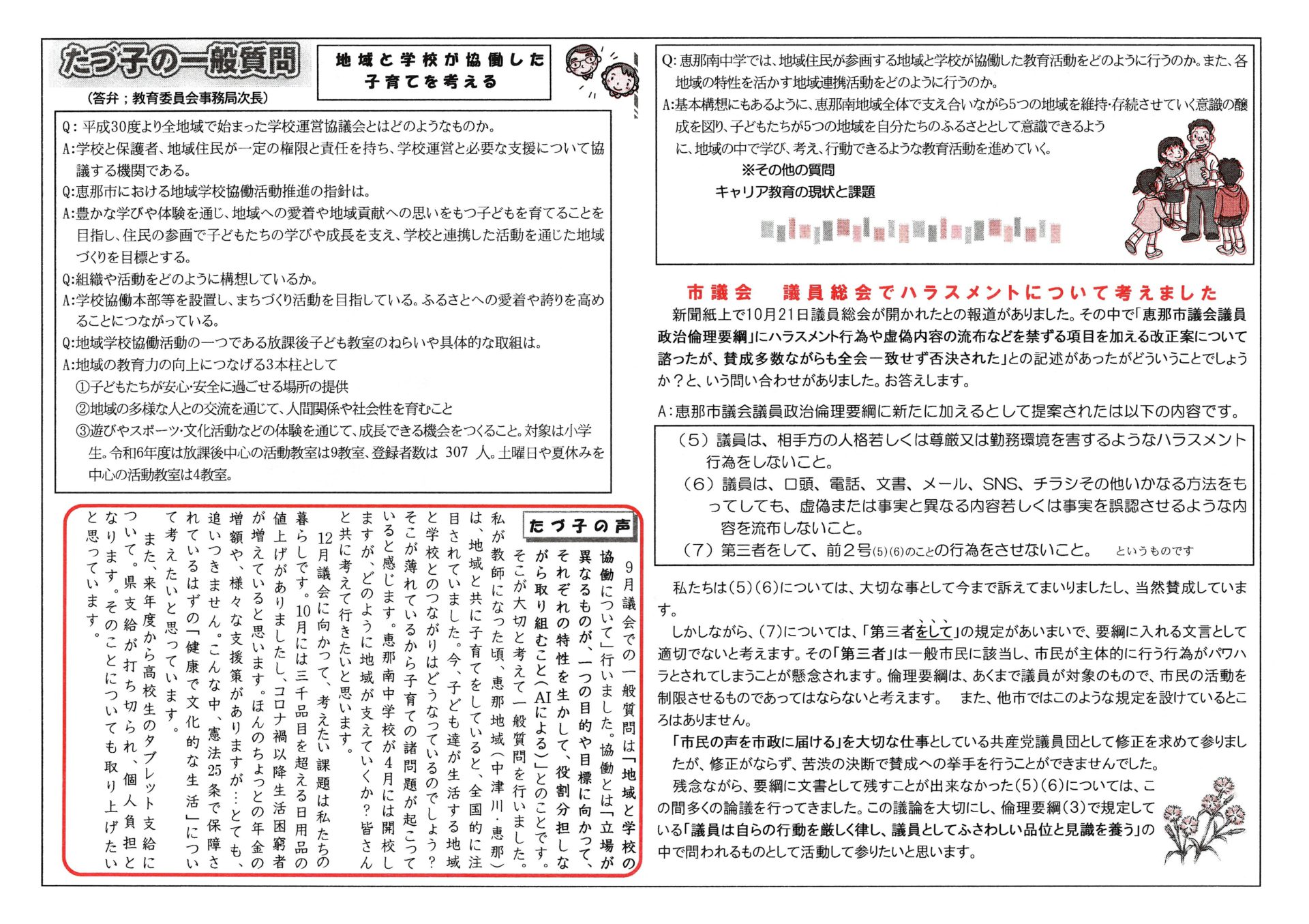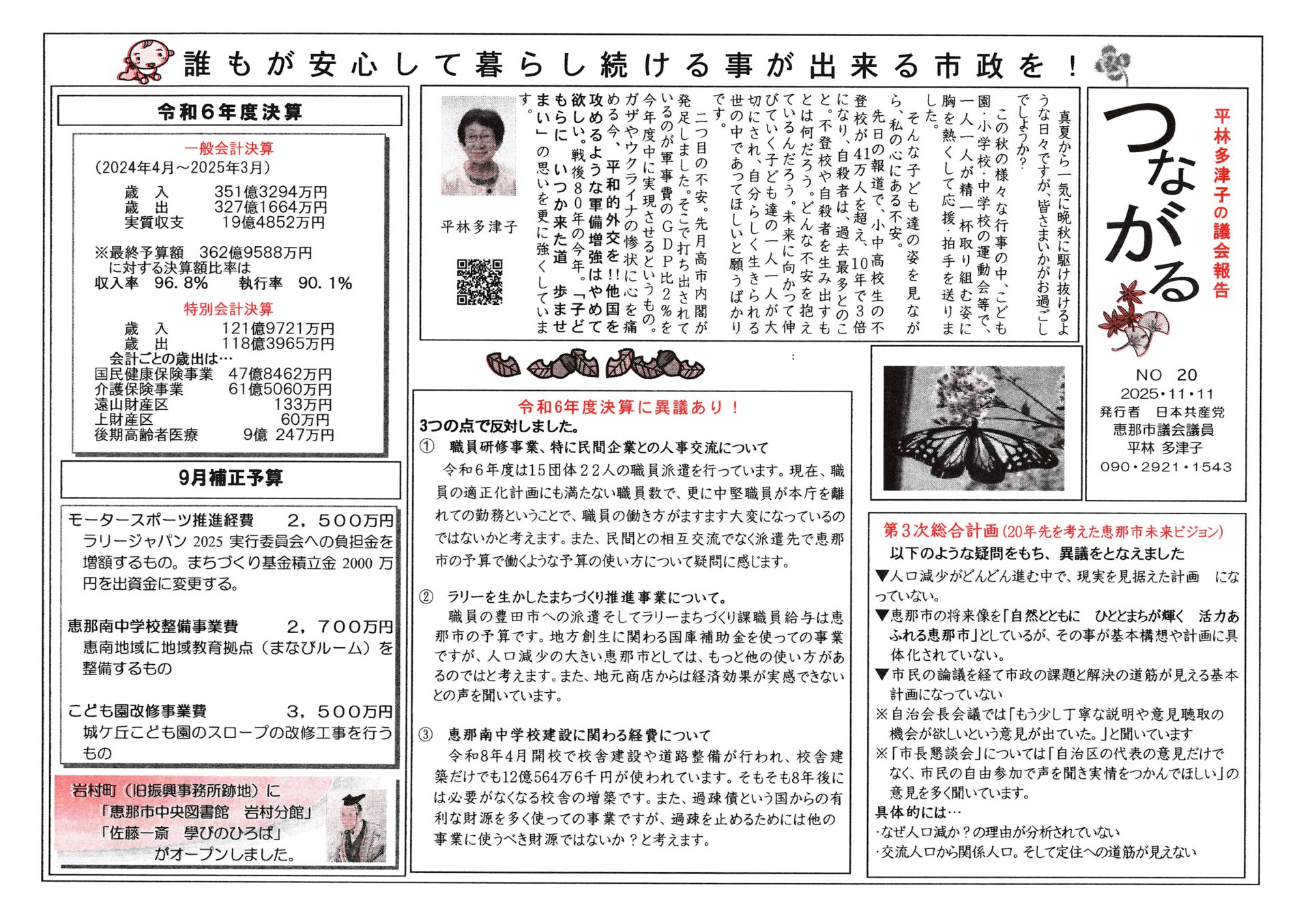 平林多津子市議の議会報告「つながる」No.20 11月11日号を発行しました。