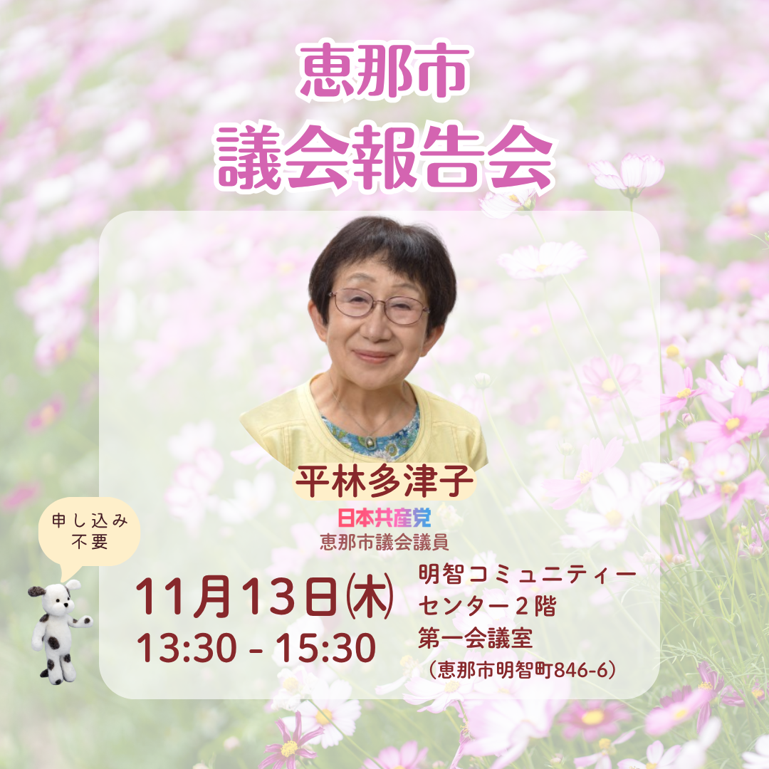 平林多津子議員の「恵那市議会報告会」を開催します。