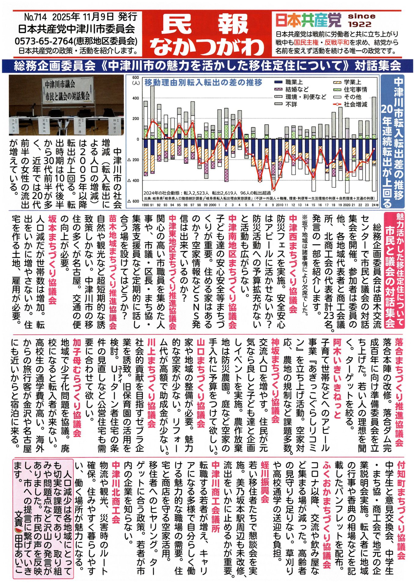 今号では、「中津川市の魅力を活かした移住定住について」をテーマに開かれた総務企画委員会の対話集会の様子を紹介しています。