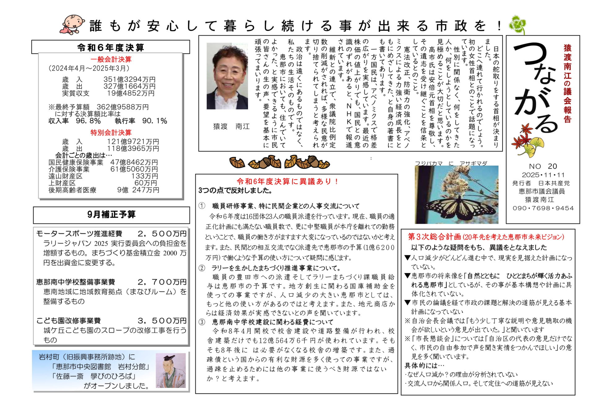 つながる さわたりみなえの議会報告 11月11日号 2025年11月14日 10時10分19秒 by 日本共産党 恵那地区委員会 猿渡南江の恵那市議会報告「つながる」第20号です。今号は、上・下水道の現状、自衛隊への若者名簿提供問題、議会のハラスメント対策、令和6年度決算のポイントなどを分かりやすくまとめています。ぜひご覧ください。 前の記事 あなたの声を聞かせてください 要求アンケート2025 【第2弾】にご協力お願いします 私たち 日本共産党は、暮らしや社会・政治の現場で感じられている「不安」「不満」「期待」を、ひとりひとりの声として受けとめるため、 「要求アンケート202... 次の記事 次の記事はありません コメントを残す コメントをキャンセルメールアドレスが公開されることはありません。 ※ が付いている欄は必須項目です コメント 名前 * メール * サイト Δ