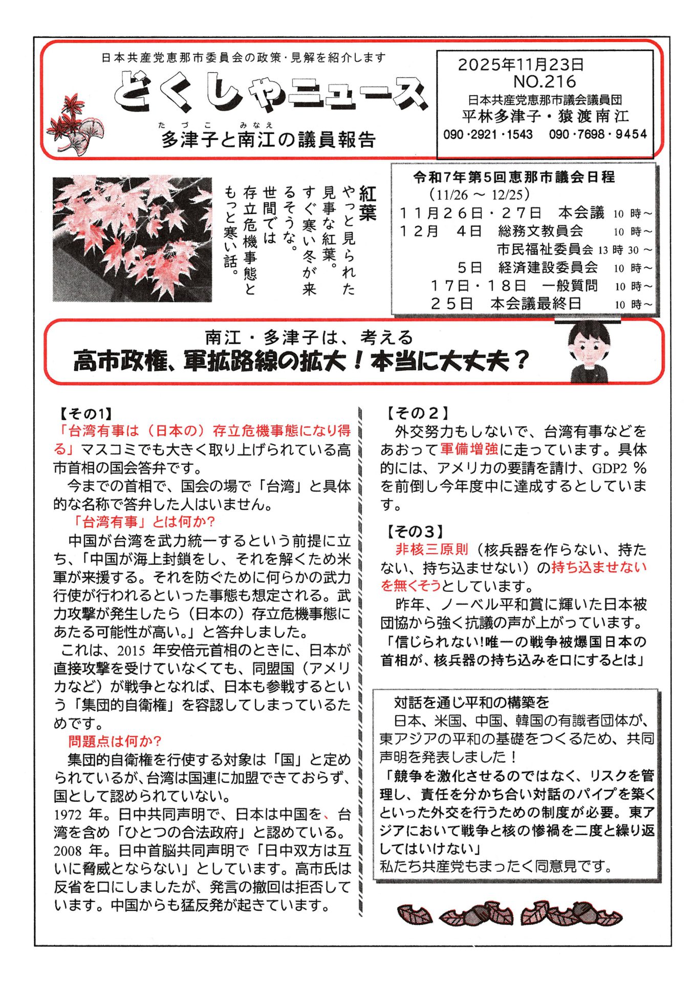 どくしゃニュース 多津子と南江の議員報告 11月23日号 2025年11月21日 12時08分30秒 by 日本共産党 恵那地区委員会 今週の「どくしゃニュース多津子と南江の議員報告」は、 今話題になっている高市首相の「台湾有事」発言について、 11月13日に明智で開催された議会報告会の報告です。 前の記事 📢11/17-18東海ブロック宣伝を行いました 11月17〜18日早朝に中津川市内各地で東海ブロック宣伝・スタンディングを行いました。 首相が「恒久財源があれば消費税を下げられる」と発言したことを受け... 次の記事 明るい恵那 11月23日号 今週の「明るい恵那」は、恵那市社保協が恵那市と懇談、そのようす、他です。 コメントを残す コメントをキャンセルメールアドレスが公開されることはありません。 ※ が付いている欄は必須項目です コメント 名前 * メール * サイト Δ