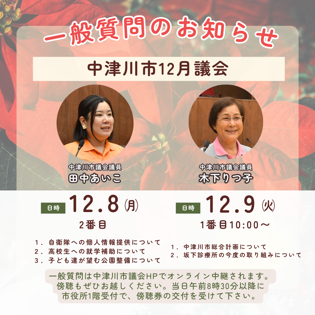 中津川市12月議会で、田中あいこ議員・木下りつ子議員が一般質問を行います。