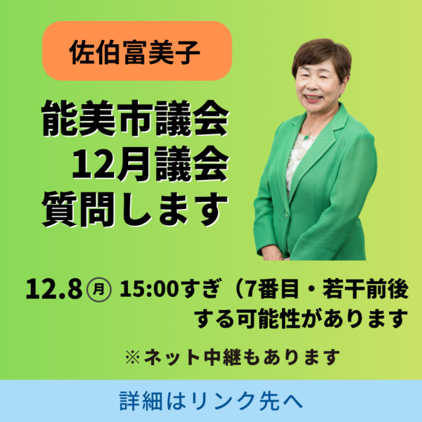 現在開会中の能美市議会12月定例会での一般質問の日時が決まりましたので、お知らせさせていただきます。