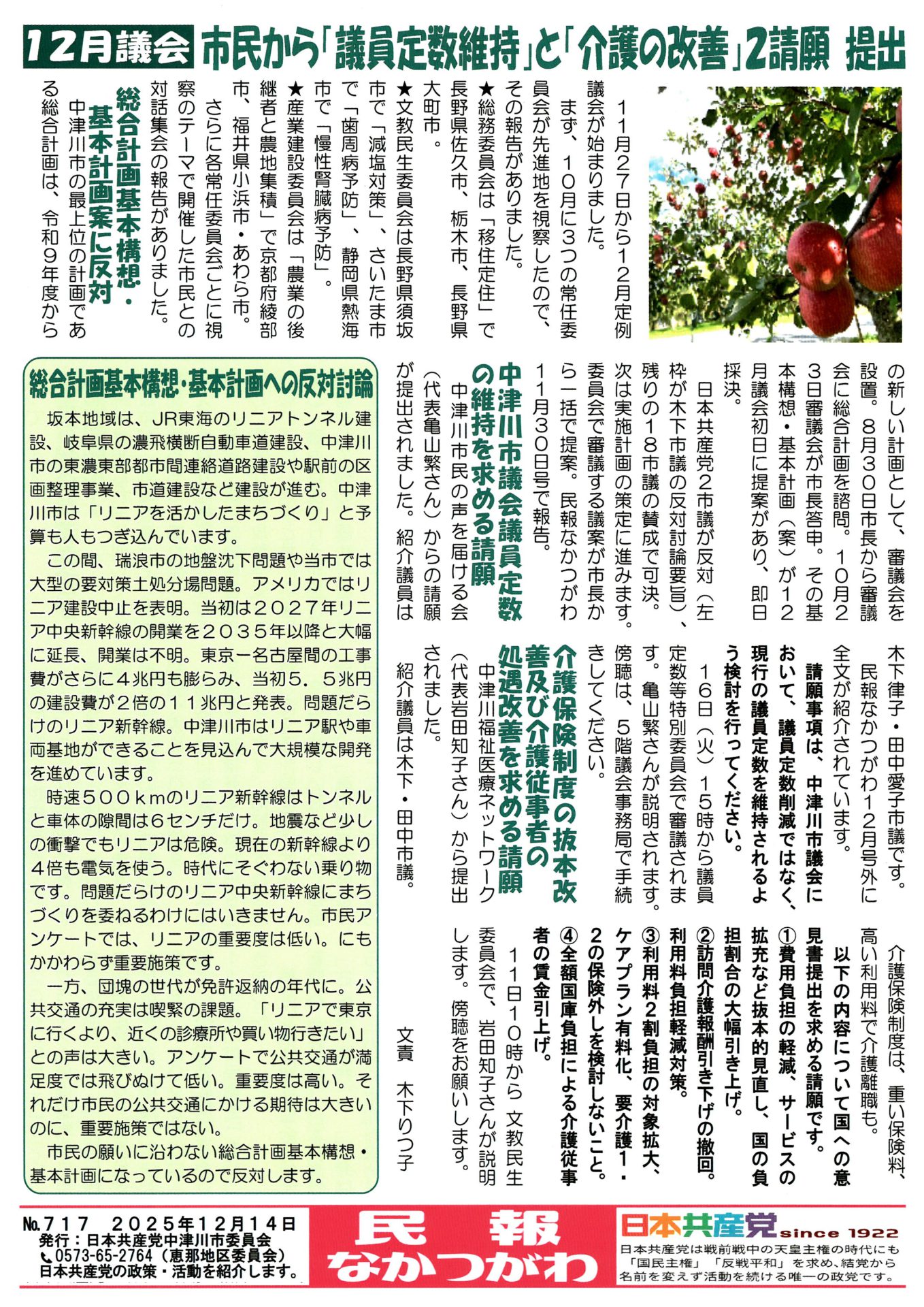 民報なかつがわ 12月14日号 「議員定数維持」「介護の改善」請願の紹介議員に 2025年12月14日 13時00分04秒 by 日本共産党 恵那地区委員会 今週の「民報なかつがわ」です。 中津川市総合計画基本構想・基本計画への反対討論では、リニア建設について触れています。 前の記事 恵那市12月議会 一般質問のお知らせ 12/17.18日に、猿渡南江市議・平林たづ子市議が一般質問に立ちます。 ぜひ傍聴へお越しください。 次の記事 どくしゃニュース 多津子と南江の議員報告 12月14日号 今週の「どくしゃニュース多津子と南江の議員報告」です。 12月議会の委員会の様子です。 コメントを残す コメントをキャンセルメールアドレスが公開されることはありません。 ※ が付いている欄は必須項目です コメント 名前 * メール * サイト Δ