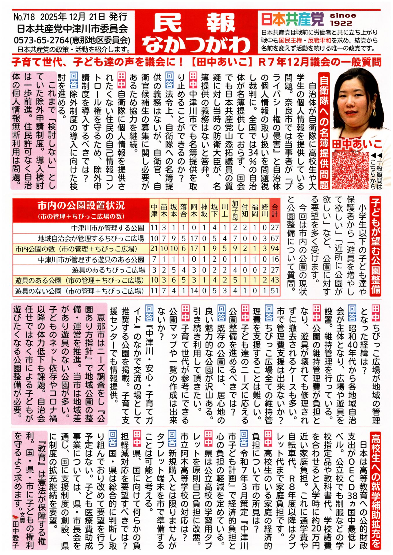 民報なかつがわ 12月21日号 《田中愛子市議 12月議会一般質問の報告》 2025年12月21日 06時00分00秒 by 日本共産党 恵那地区委員会 今週の「民報なかつがわ」です。 前の記事 中津川駅前で赤旗宣伝 日本共産党中津川市委員会は12日夕方、中津川駅前で、赤旗街頭宣伝を行いました。通行人に「しんぶん赤旗」見本紙を配布し、シールアンケートへの協力を呼び... 次の記事 どくしゃニュース 多津子と南江の議員報告 12月21日号 《国民健康保険・SL復元について》 今週の「どくしゃニュース多津子と南江の議員報告」です。 コメントを残す コメントをキャンセルメールアドレスが公開されることはありません。 ※ が付いている欄は必須項目です コメント 名前 * メール * サイト Δ