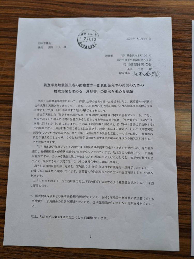 請願第1号 能登半島地震の被災者の医療費負担免除の再開のための財政支援を求める請願が総務民生常任委員会で全委員の皆さんの賛成で採択され、大変嬉しく思います。また、県と国が医療費免除とともに介護保険サービス利用料の免除を含めて再開するよう引き続き要望をしていきたいと思います。