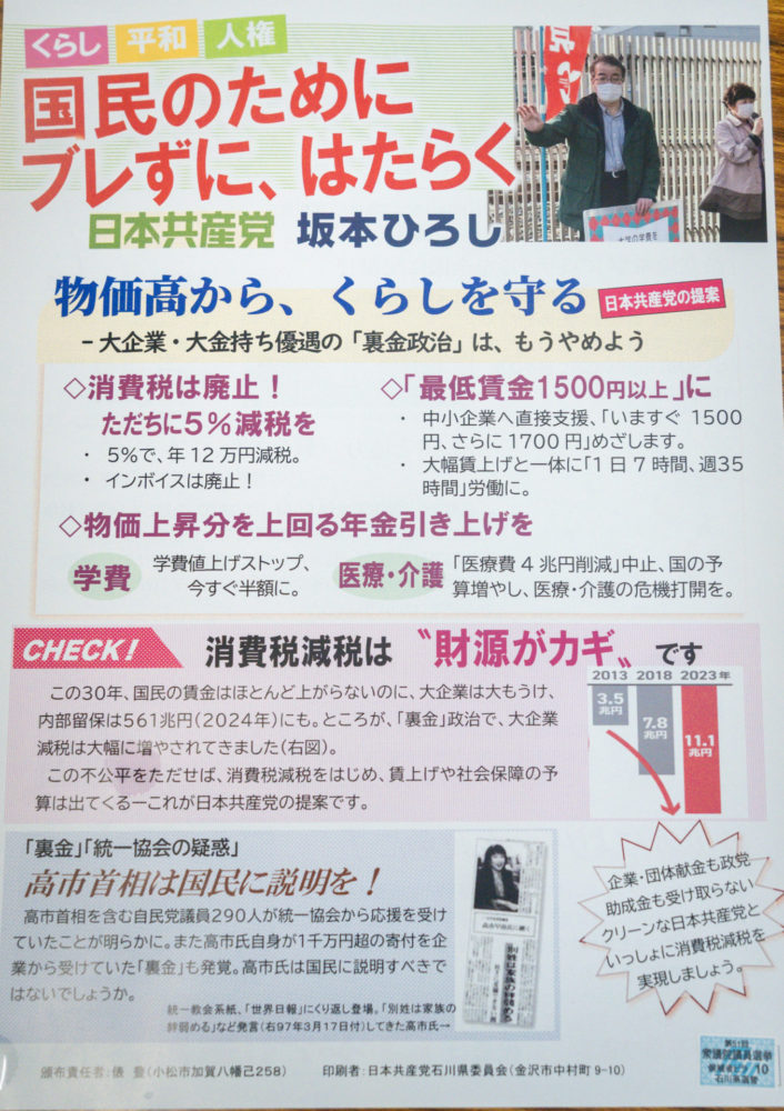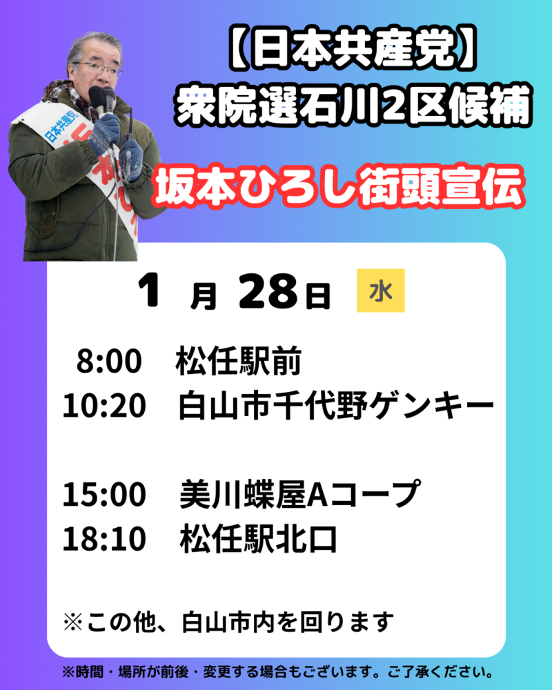 本日、衆議院選挙が公示され能美市を含む石川2区には日本共産党の坂本ひろし候補が立候補しました。 2月8日の投票日までお世話になりますがよろしくお願いいたします。