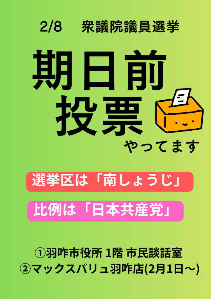 ぜひ期日前投票もご活用いただき、選挙区は「南しょうじ」、比例は「日本共産党」への一票をよろしくお願いいたします。