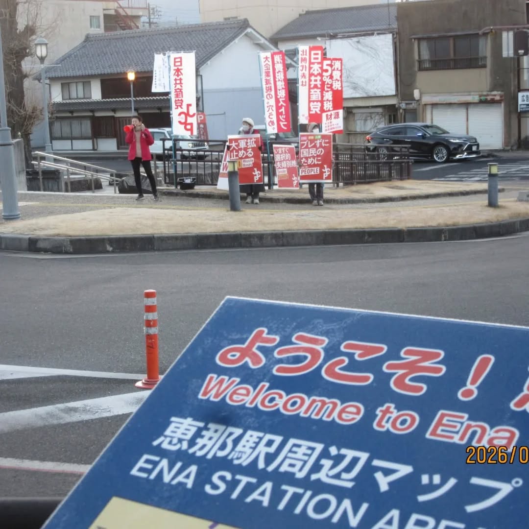 恵那市内各地にて、猿渡南江恵那市議・平林たづ子恵那市議もうったえながら、メガホン宣伝・スタンディングを行っています。