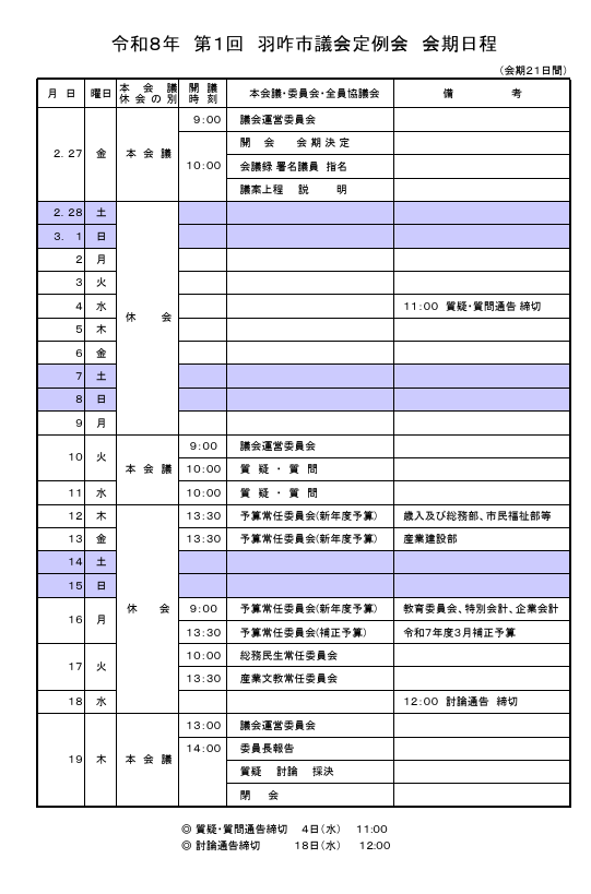 2月27日~3月19日まで開催され、予算や市の施策について討論が行われます。