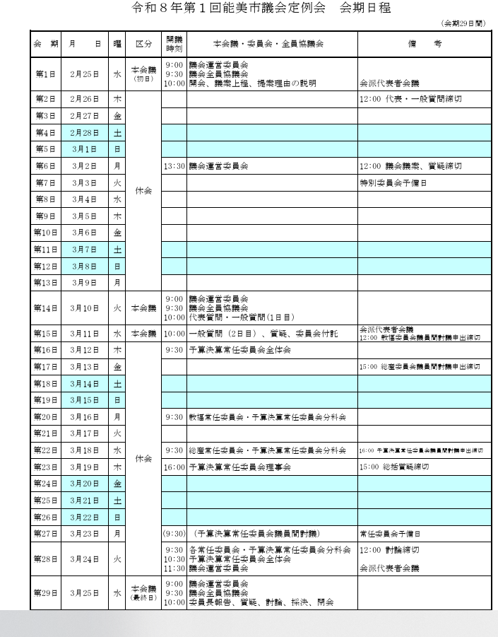 能美市の3月定例議会の日程が発表されました。