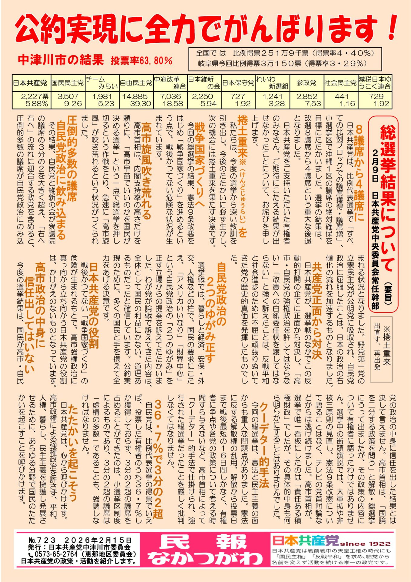 今回の結果は、物価高騰のもとで暮らしの不安が広がる中、自民党政治の行き詰まりがいっそう深まる一方で、政治のゆがみを正す確かな力が十分に広がりきらなかったことのあらわれでもあります。