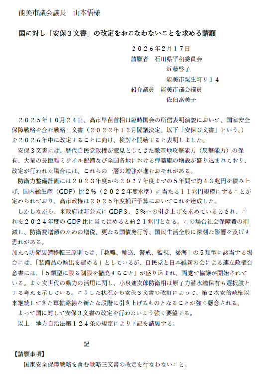 安保改定三文章の改定は日本を戦争できる国に作り変えるあまりにも危険な内容です。請願内容と合わせ、議員の皆さんには三文章の改定を行わないよう国に求めていただきたいと思います。 以上趣旨説明とさせていただきます。