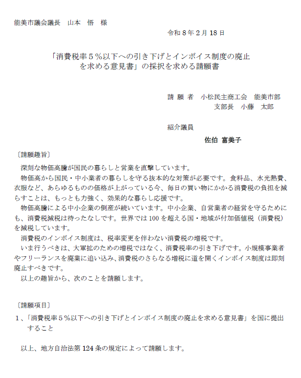 消費税率を5%以下に引き下げ市民生活を守る、インボイス制度は廃止して中小零細御者の営業を守ることの意見書を国に求める請願に議員皆さんの賛同をお願いいたしまして、趣旨説明とします。