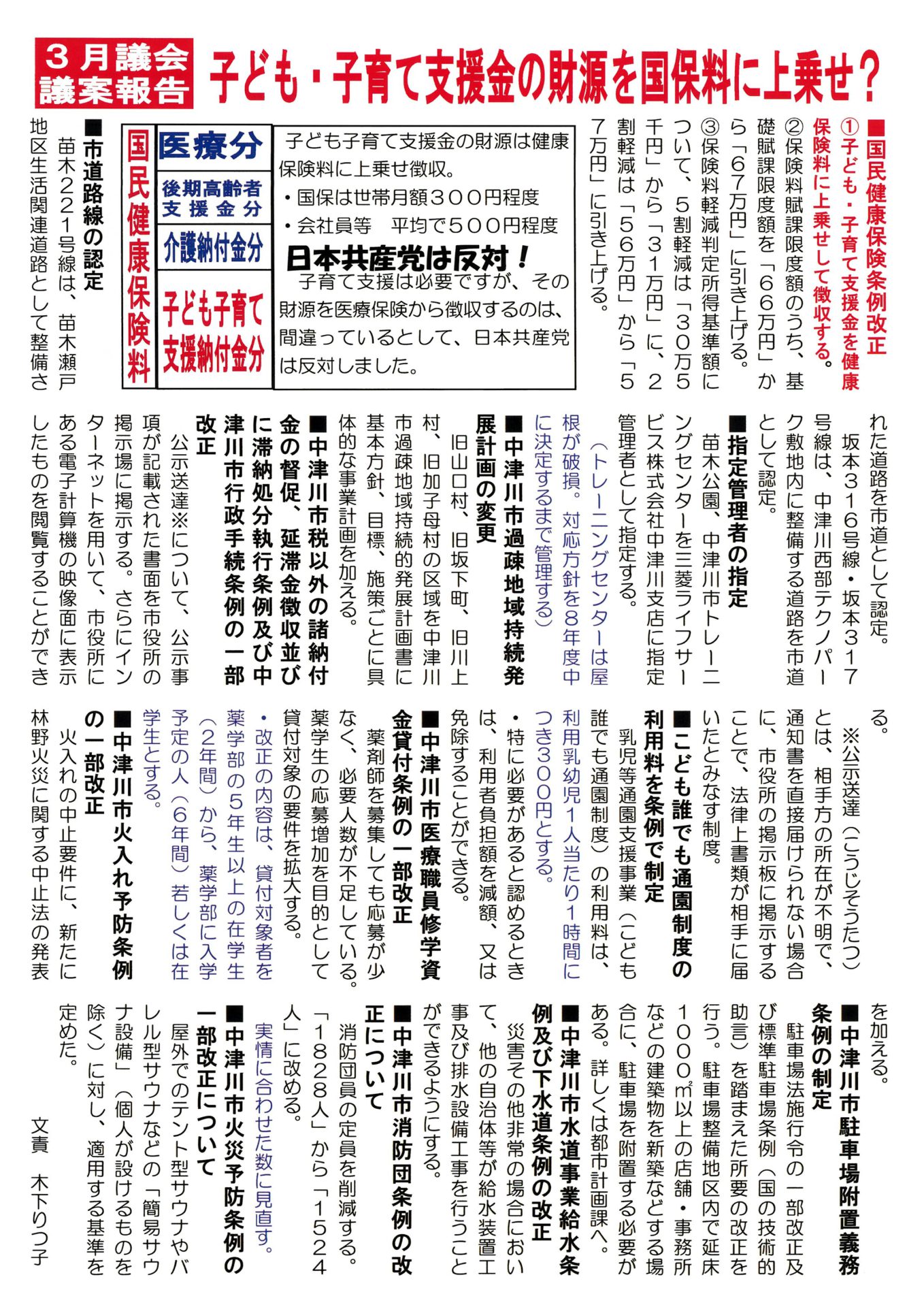 裏面は、3月議会の議案報告として、子ども・子育て支援金の国保料上乗せ問題や各種条例改正のポイントを整理し、市民生活への影響を解説しています。