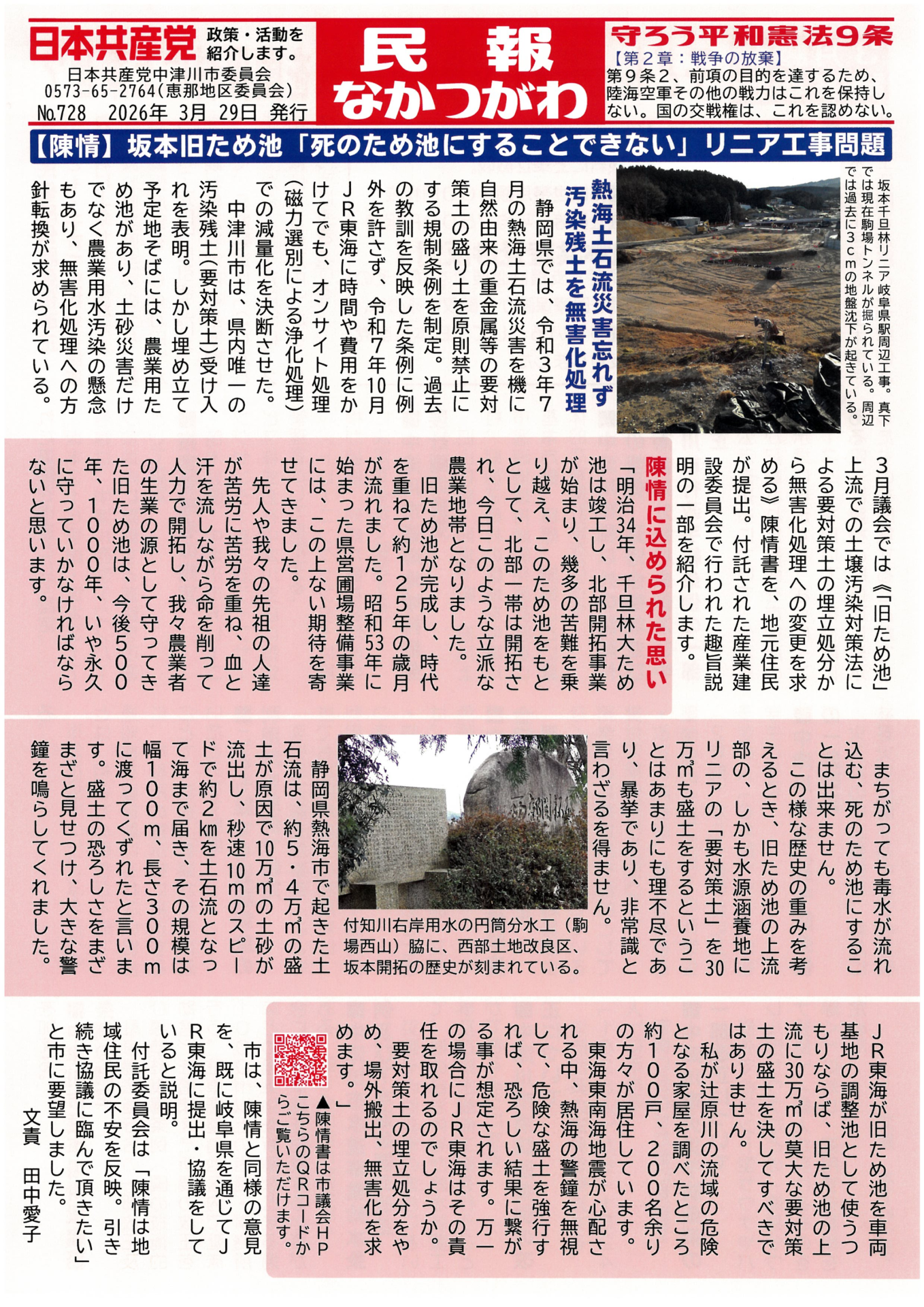 「民報なかつがわ」3/29号の表面は、坂本旧ため池をめぐるリニア工事問題の陳情を中心に、土石流災害や土壌汚染への懸念、無害化処理を求める住民の声を紹介しています。