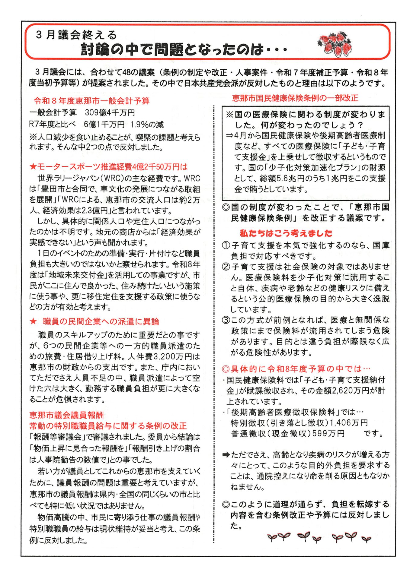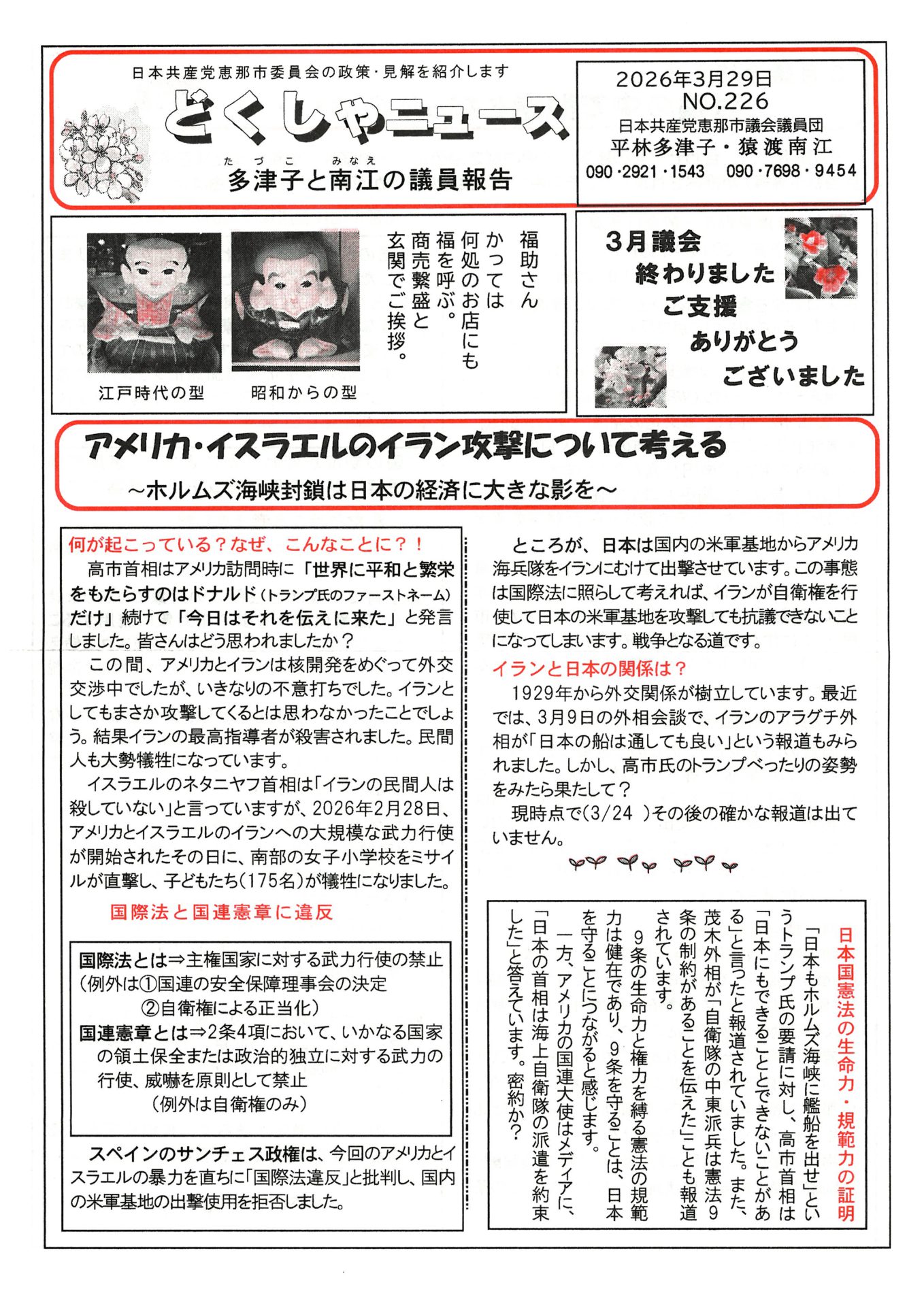 どくしゃニュース 多津子と南江の議員報告 3月29日号【アメリカ・イスラエルのイラン攻撃について考える】 2026年03月30日 10時23分54秒 by 日本共産党 恵那地区委員会 今週の「どくしゃニュース多津子と南江の議員報告」です。 前の記事 民報なかつがわ 3月29日号【中津川市3月議会・リニア工事要対策土についての陳情】 「民報なかつがわ」3/29号の表面は、坂本旧ため池をめぐるリニア工事問題の陳情を中心に、土石流災害や土壌汚染への懸念、無害化処理を求める住民の声を紹介... 次の記事 次の記事はありません コメントを残す コメントをキャンセルメールアドレスが公開されることはありません。 ※ が付いている欄は必須項目です コメント 名前 * メール * サイト Δ