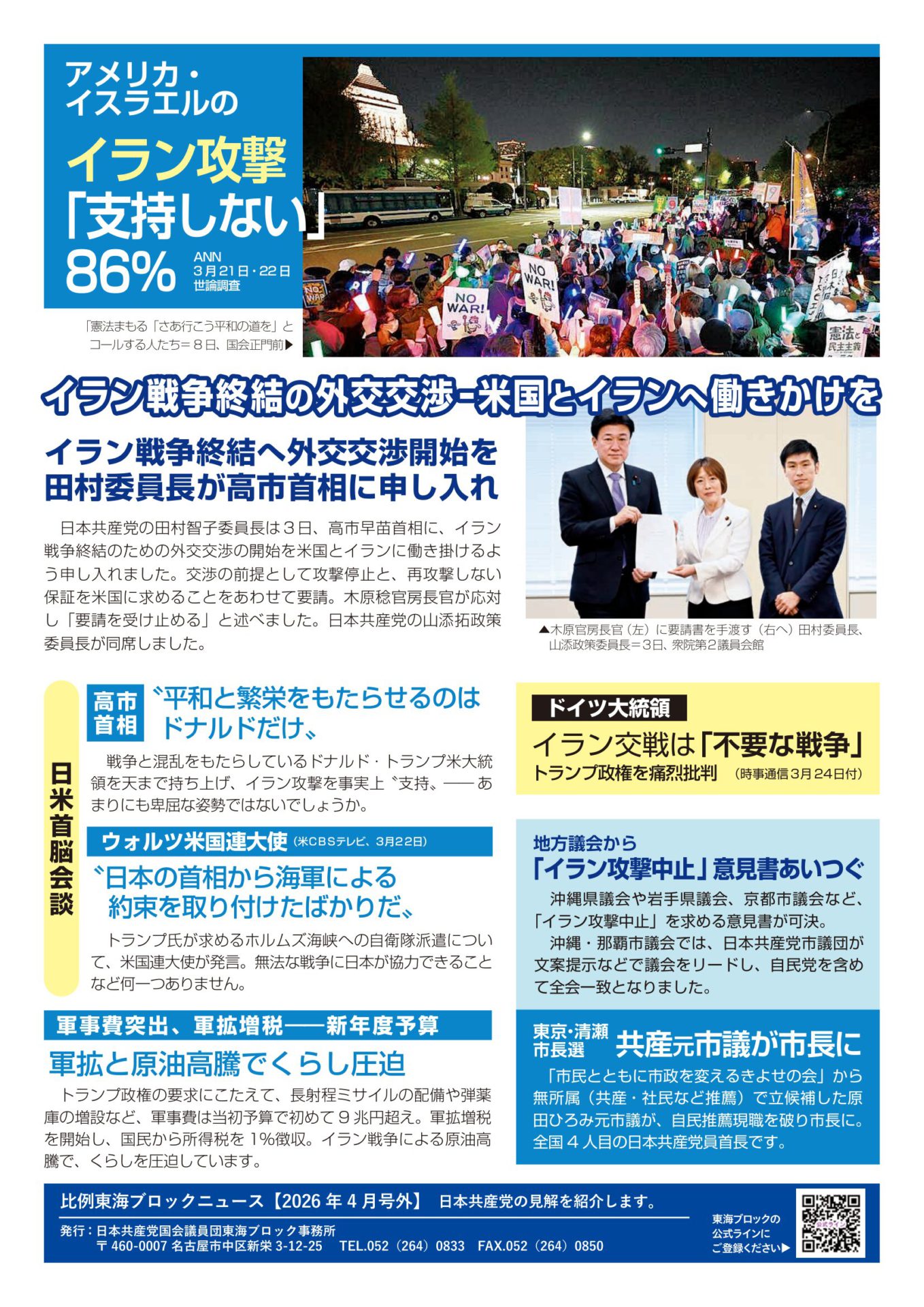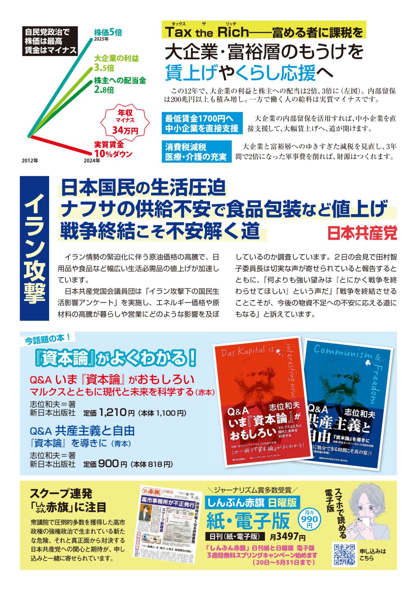 アメリカ・イスラエルによるイラン攻撃に対し、戦争終結へ外交交渉を求めること、物価高騰やエネルギー価格上昇が暮らしに与える影響、大企業・富裕層への応分の負担による賃上げとくらし支援の必要性を訴えました。