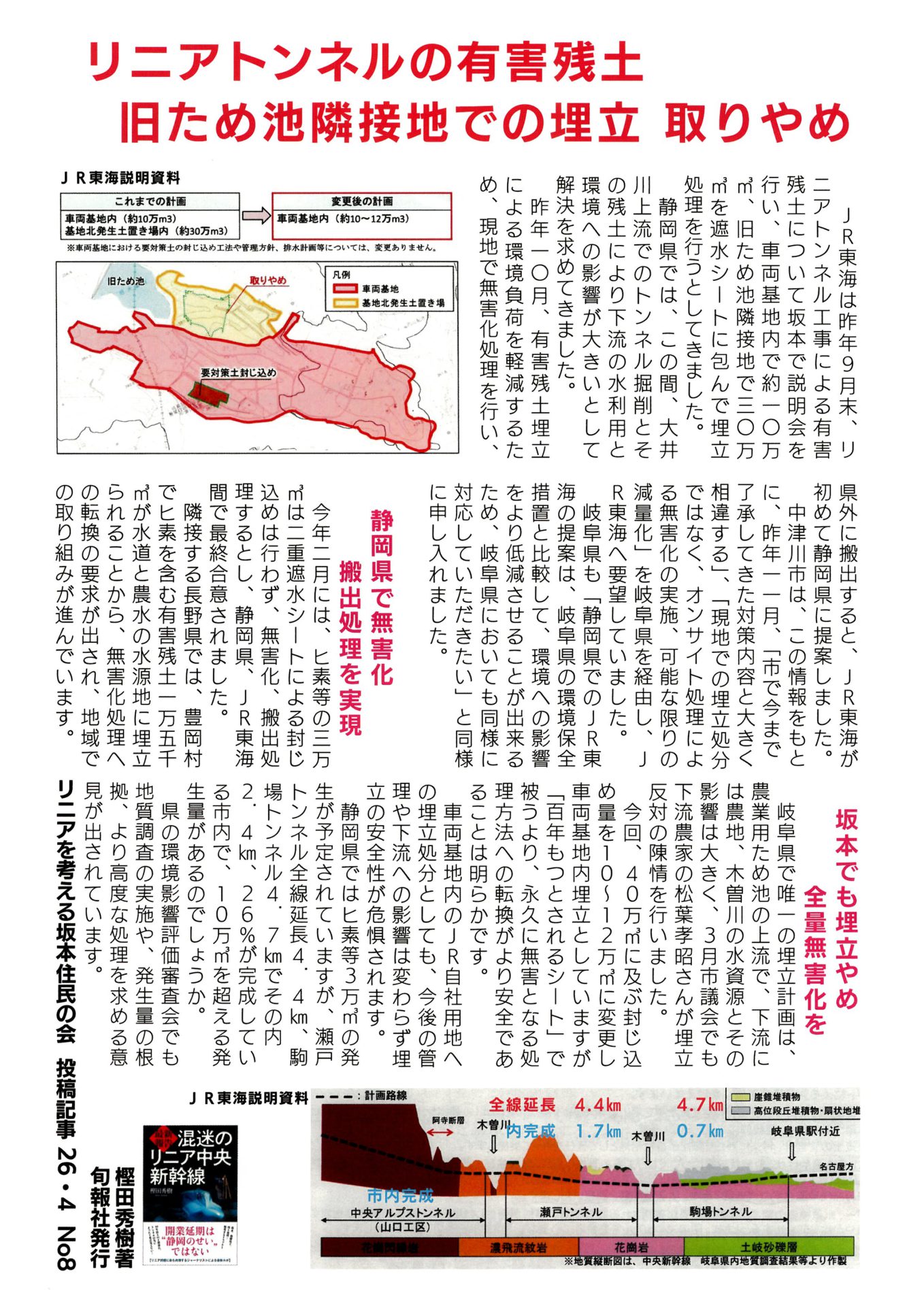【寄稿】リニア工事と残土処理をめぐる課題 2026年04月23日 13時13分17秒 by 日本共産党 恵那地区委員会 リニア中央新幹線工事に伴う「残土問題」について、「リニアを考える坂本住民の会」から寄稿をいただきました。 静岡県での無害化処理の取り組みなども紹介されています。 リニアの問題は、一部の地域だけでなく広くつながっています。ぜひご覧ください。 前の記事 民報なかつがわ 4月26日号 今週の「民報なかつがわ」です。 次の記事 どくしゃニュース 多津子と南江の議員報告 4月26日号【公営住宅と空き家対策、問われるこれから】 議会報告「どくしゃニュース」を発行しました。 今回のテーマは、・公営住宅のこれから・特定空き家の問題など、暮らしに関わる身近な課題です。 「安心して... コメントを残す コメントをキャンセルメールアドレスが公開されることはありません。 ※ が付いている欄は必須項目です コメント 名前 * メール * サイト Δ