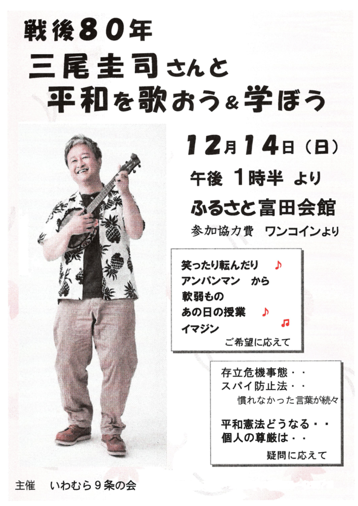 歌とお話を通じて、平和についてあらためて考える場として、ウクレレ演奏で親しまれている三尾圭司さんを迎えます。身近な曲から「イマジン」まで参加者のみなさんと一緒に歌いながら、平和の大切さを共有する時間です。