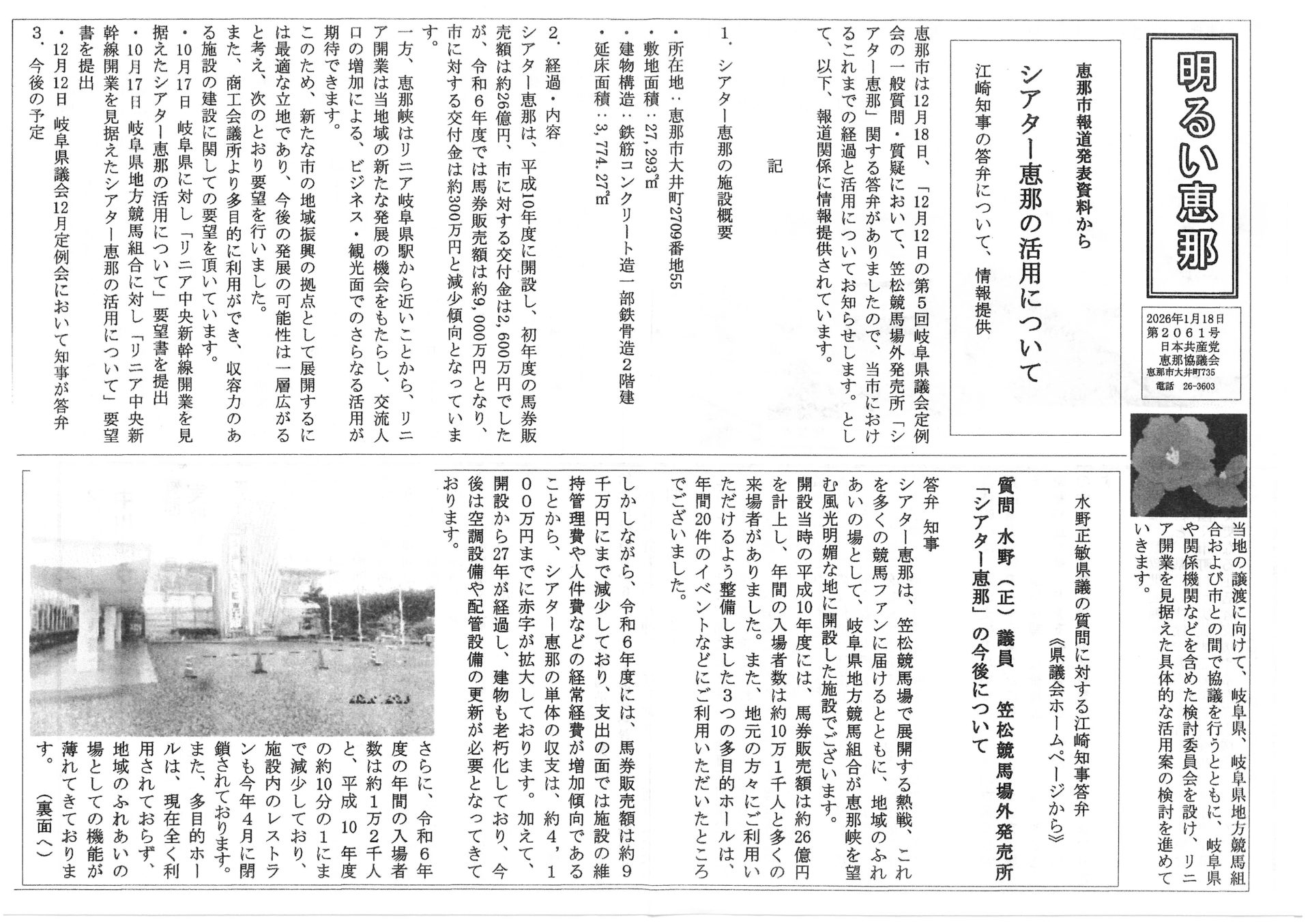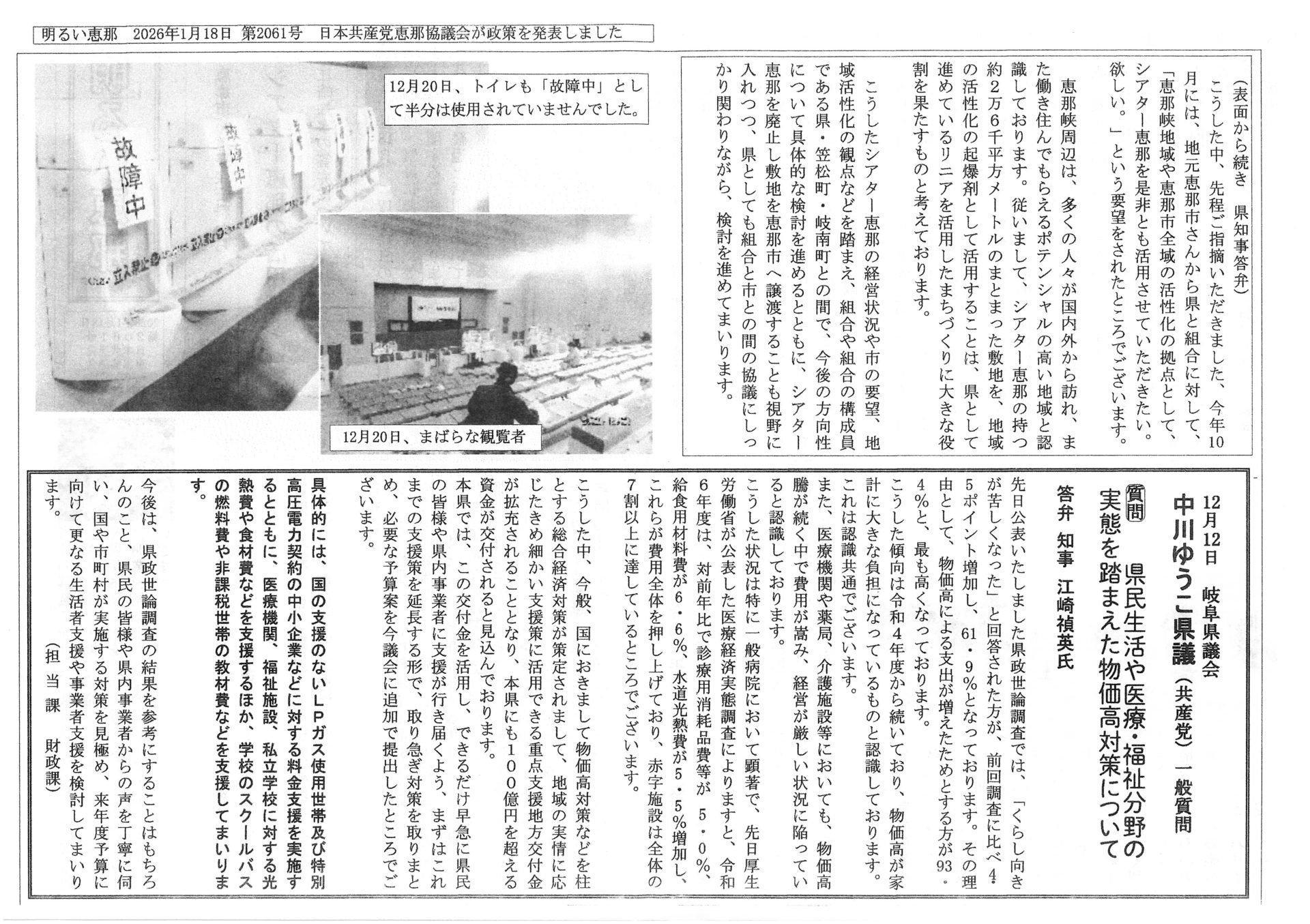 明るい恵那 1月18日号 2026年01月19日 11時10分37秒 by 日本共産党 恵那地区委員会 今週の「明るい恵那」です。 前の記事 民報なかつがわ 1月18日号 今週の「民報なかつがわ」です。 次の記事 Instagram・Threads開設のお知らせ SNSでの情報発信についてInstagramおよびThreadsを開設しました。日々の活動の様子や街の声、取り組みの現場などを発信しています。ぜひフォローしてください... コメントを残す コメントをキャンセルメールアドレスが公開されることはありません。 ※ が付いている欄は必須項目です コメント 名前 * メール * サイト Δ