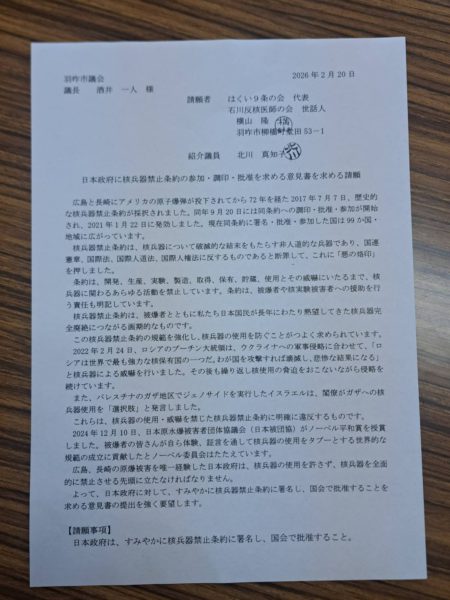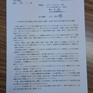 | 2013年4月 | “憲法9条を守ろう”とはくい9条の会を設立。以後今日まで“街頭でのスタンデイング”や原爆展の開催などを取り組んでいます。 |